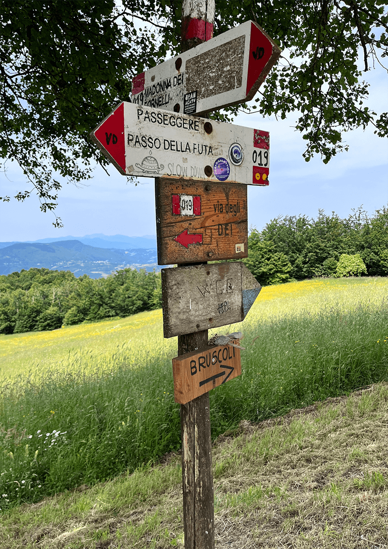Ci alziamo pronti a tornare in sella: oggi ci attende la tappa più ardua! L’appennino Tosco-Eiliano sa essere ostico e alcuni tratti richiedono una certa abilità sia in salita come in discesa. Il percorso di snoda lungo magnifici boschi oggi siamo immersi nella natura dalla partenza all’arrivo. Al Passo della Futa visita al grande cimitero germanico della seconda guerra mondiale prima del pranzo al sacco con il famigerato panino degli Dei che avevamo acquistato alla partenza. Ci troviamo al bivacco della bruciata, un luogo che ci ha colpito per la solidarietà fra viandanti, con alcune casse dove prendere o lasciare qualcosa per le persone che arrivano dopo di te.